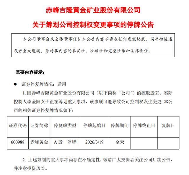 3月19日,赤峰黄金(600988.SH)发布公告,公司于2026年3月18日晚间收到控股股东、实际控制人李金阳通知,李金阳及其一致行动人正在筹划将所持公司股份进行转让的重大事项,该事项可能导致公司实际控制人发生变更。上述事项正在洽谈中,尚存在不确定性,为保证公平信息披露,经公司向上海证券交易所申请,公司股票于2026年3月19日上午开市起停牌,预计停牌时间不超过5个交易日。