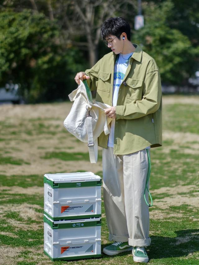 白色宽松字母T恤,搭配绿色工装衬衫外套,是大多数男生喜欢的松弛感穿搭,下身搭配一条米色工装裤,又休闲又好穿,舒适度满分!