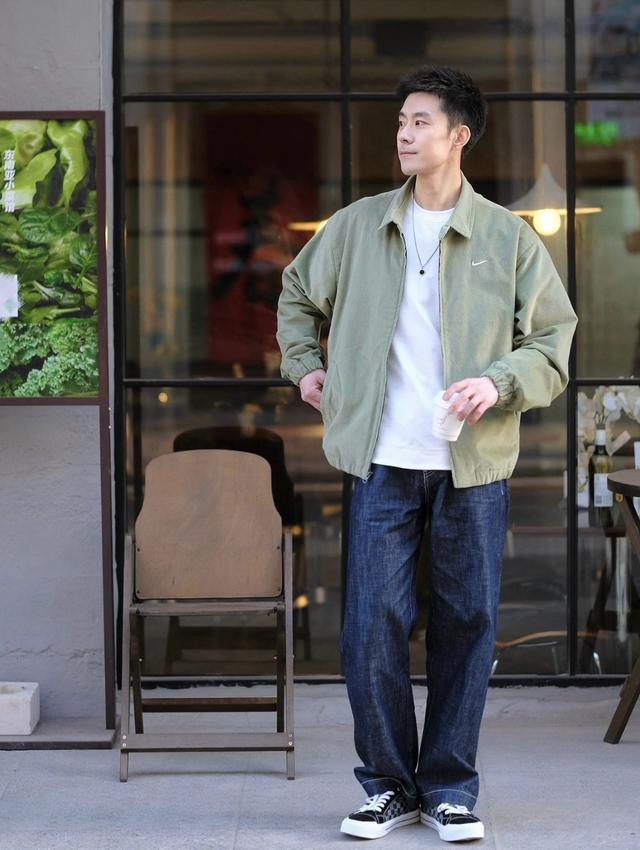 白T恤配上豆绿色夹克外套和深色牛仔裤,三件都是纯色基础款,但穿起来后那种清爽的少年感扑面而来,这怎么不是另类的时尚感呢?