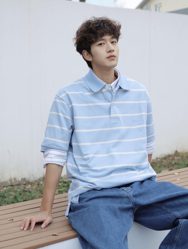 浅蓝色条纹Polo衫叠穿白色衬衫,很干净、治愈的颜色搭配,下身选择蓝色牛仔裤,自带清爽与清新,很有男大氛围感噢~