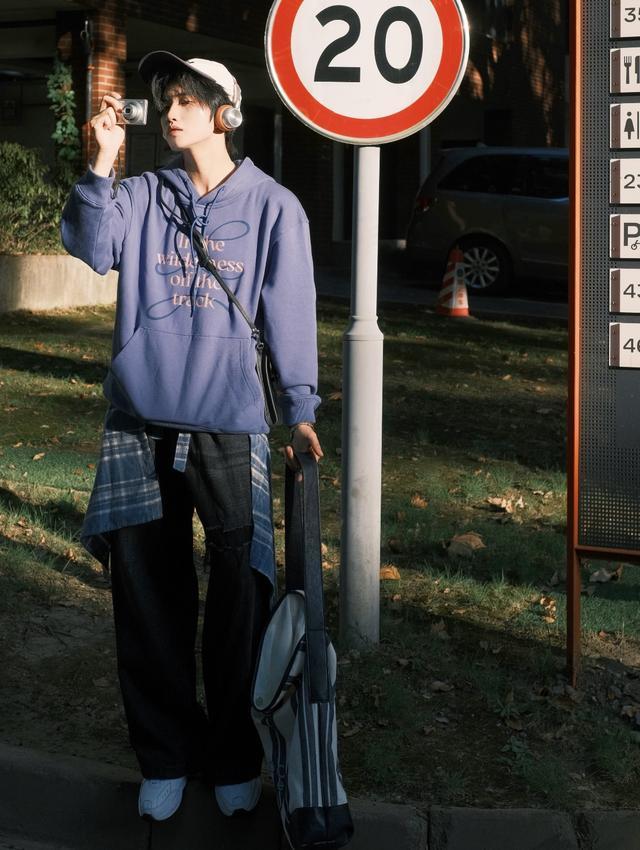卫衣穿搭虽迟但到!宽松大版的连帽卫衣减龄效果满满,搭配深色工装裤,把格子衬衫作为配饰围在腰间,打造穿搭的层次与细节。配饰选择鸭舌帽、耳机、帆布包等,文艺男青年穿搭get。